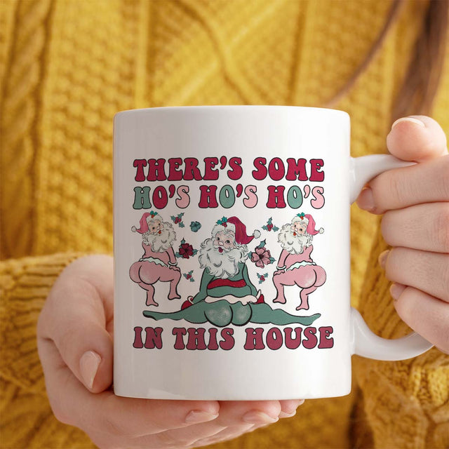 Featuring a witty holiday phrase "There Is Some Ho's Ho's Ho's In The House" alongside charming Christmas graphics, this mug adds a humorous twist to your festive celebrations.